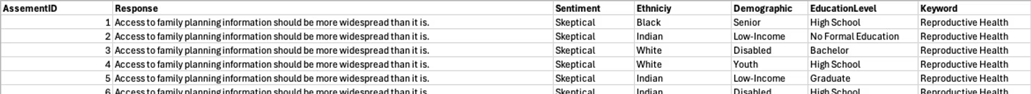 Each response to the survey incorporates an assessmentID as the identifier. For each response we also collect the overall sentiment, ethnicity, demographic, education level, and an assigned keyword to decipher between the different types of health assement. Within our data, we notice that the demographic information lacks consistency and unification regarding the category it is to support. Meaning, age category vs. disability vs. economic class and citizenship is grouped into one column. At this stage, it is not clear how to handle this but important to note upon initial assessement of data attributes.