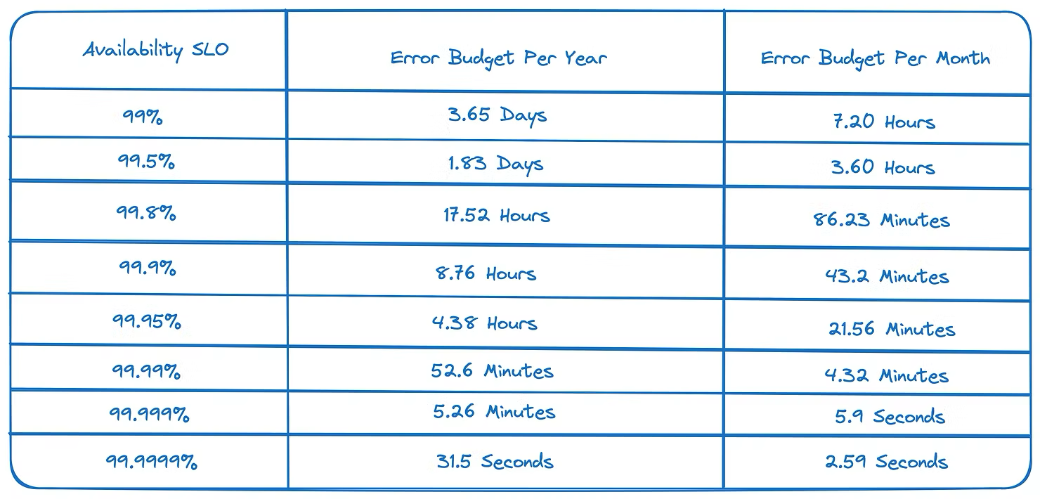 Like SLIs, the creation of SLOs is not merely a procedural task but an integral part of the broader discipline of reliability engineering. SLOs function as critical benchmarks for service delivery, allowing teams to systematically assess whether their systems are operating within acceptable limits. SLOs are also the inverse of "Error Budgets" (EB), creating a speedier way to identify the effort required for the level of reliability you want to achieve. The level of reliability is referenced as the number of 9's you want to achieve. In our SLI example, we may want to save on cost and effort, and feel 3 nine's is ideal, resulting in 43.2 minutes of budget to expend each month.