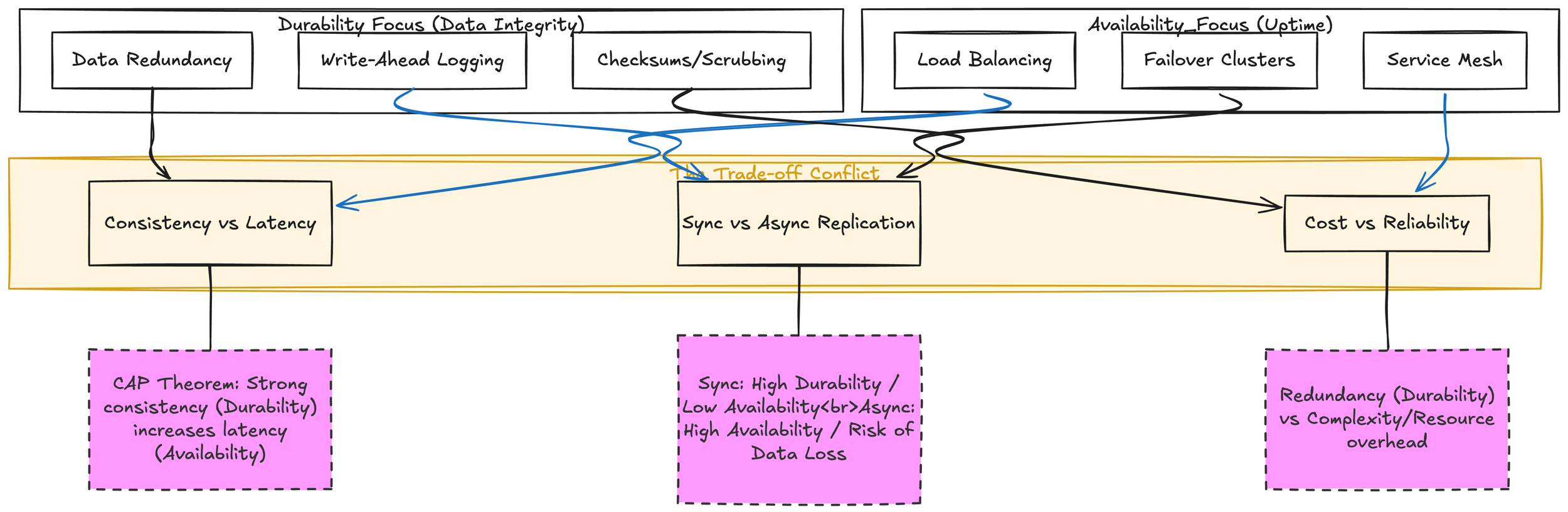 The image below displays the tradeoffs between the two. Durability’s extra copies and write amplification can raise latency and cost and impact availability, while availability optimizations (caching, relaxed consistency) can expose windows of non-durability, and synchronous replication/strong consistency can improve durability at the expense of availability during partitions.